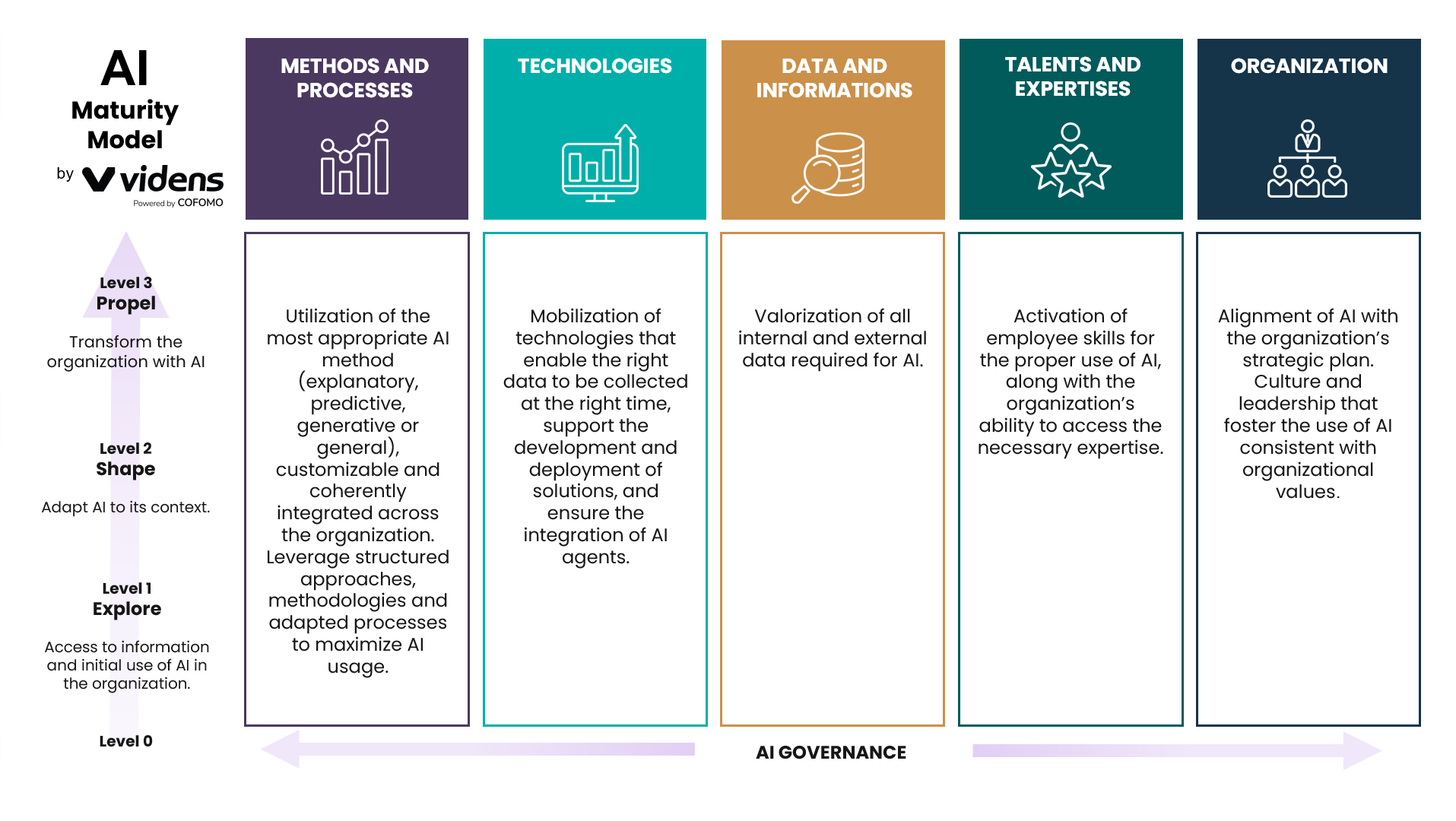 The maturity model developed by Videns, powered par COFOMO, helps organizations assess their current state and plan their evolution across three levels :